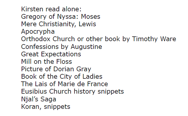 We did tons of reading aloud, and in fact, we spent a whole hour every morning in this pursuit. Here is my 2009/2010 plan for what the read aloud with my jr high and high school students: